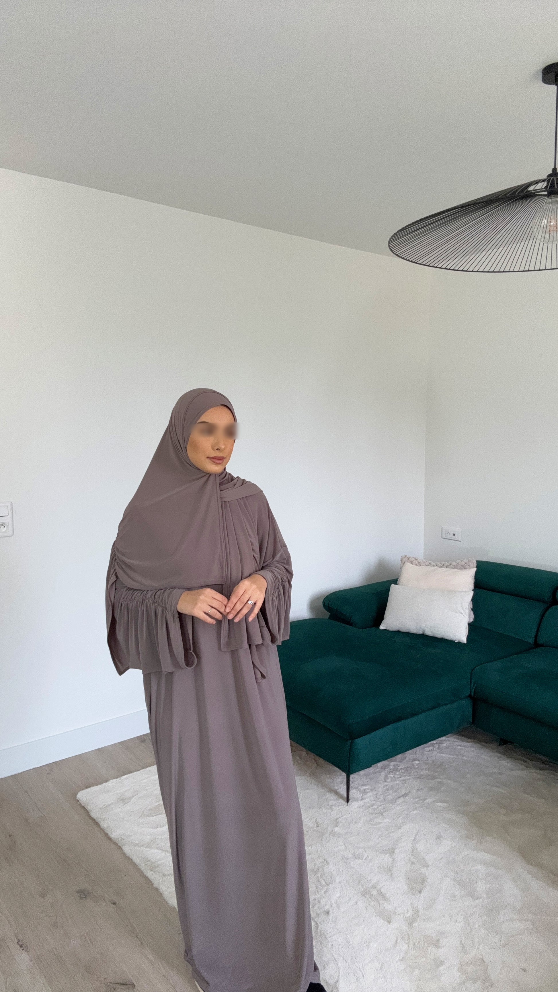 La robe est de taille unique et peut être reportée jusqu’à grand 46 et d’une taille d’1m60 à 1m80