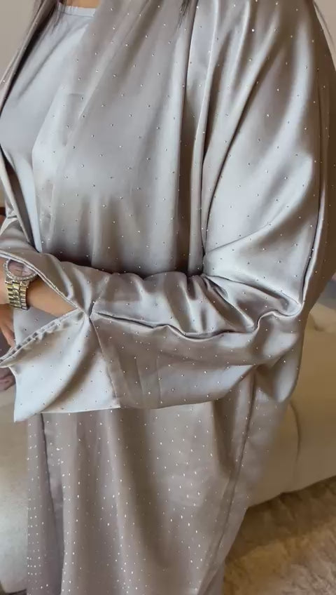 Laissez-vous séduire par l’ensemble Abaya et kimono strassé, une pièce unique qui allie raffinement et modernité. Orné de strass résistants qui ne s’enlèvent pas à la machine, ce kimono offre une touche lumineuse et sophistiquée à votre tenue.